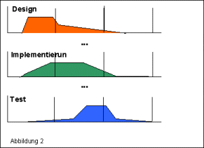 Dieser Überzeugung liegt die (oft unbewusste) Vorstellung zugrunde, dass jeder der verschiedenen Aspekte eines Softwareprojektes (Anforderungsanalyse, Architektur, Design, Implementierung, Test, Dokumentation) mit einem Hügel gleichgesetzt werden kann, der abgetragen werden muss. Diese Vorstellung wird auch genährt durch Diagramme wie das in der nebenstehenden Abbildung. Man weiß, dass man für jeden Hügel Spezialisten benötigt (also z.B. Designer, Software-Entwickler, Tester etc.), aber implizit besteht die Vorstellung, dass jeder Mitarbeiter sozusagen an seinem Hügel arbeitet und sobald jeder seine Arbeit getan hat, d.h. seinen Hhügel abgetragen hat, ist das Softwareprojekt fertig.